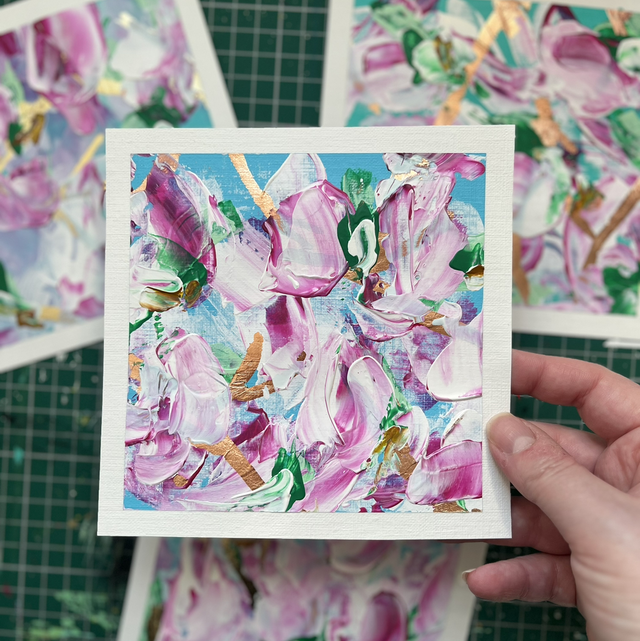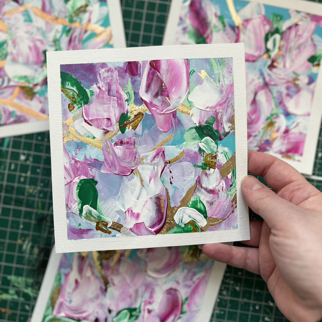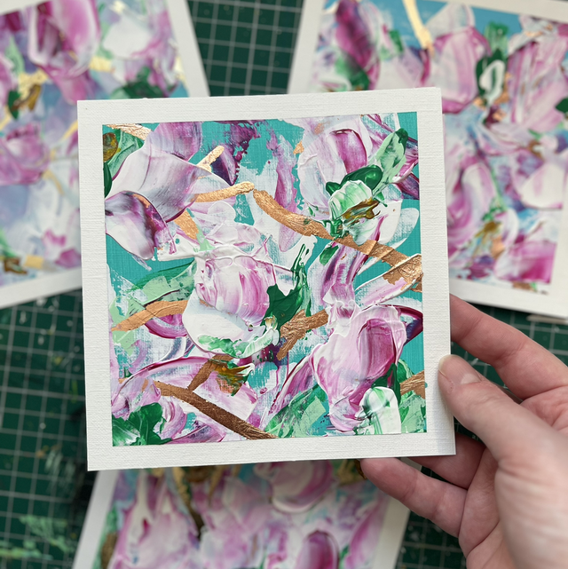Set of four magnolia paintings, acrylic on canvas paper. Mounted